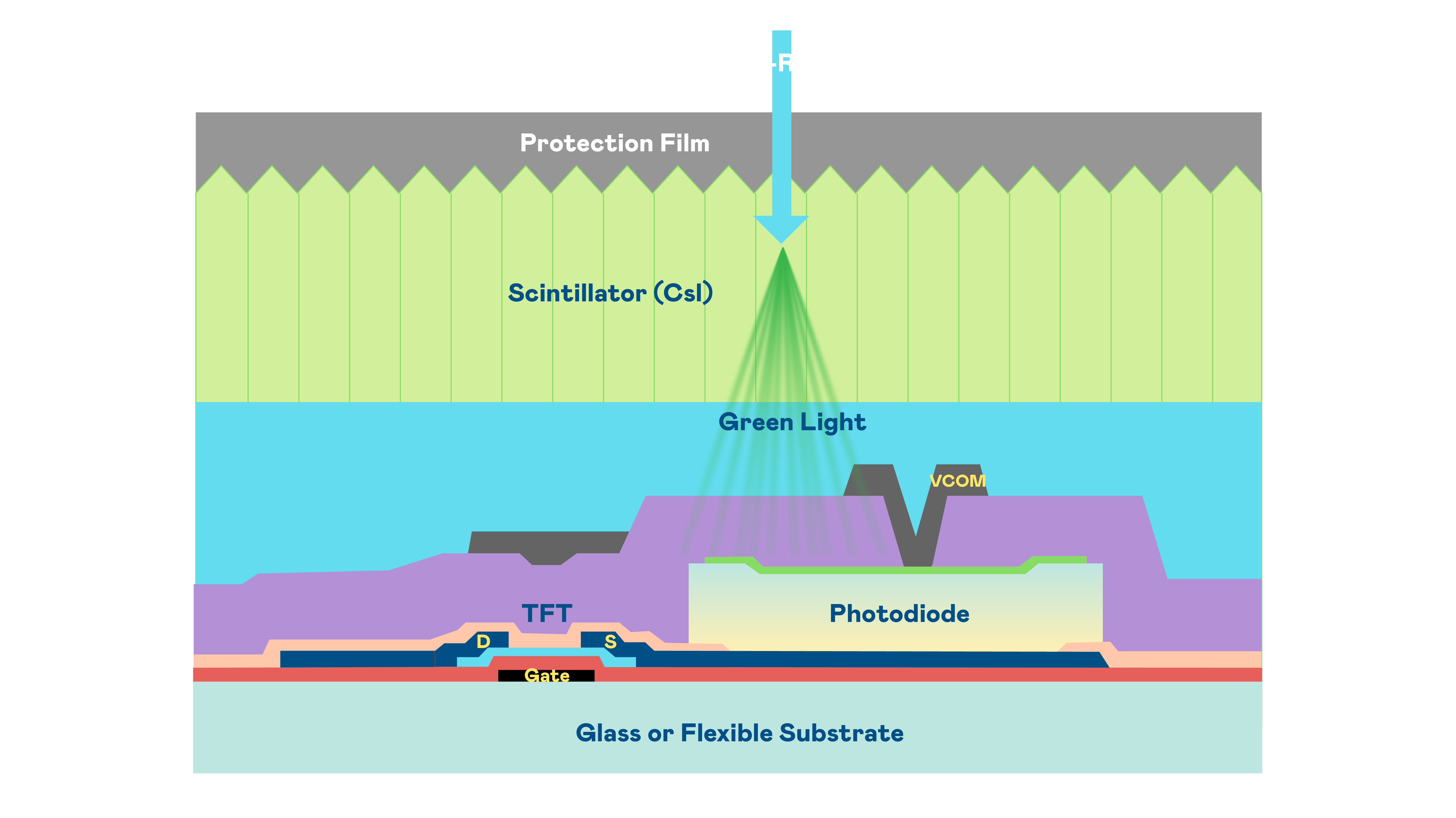 BC贷的X光影像感测阵列使用薄膜电晶体 (TFT) 作为每个像素的读取开关,搭配光电二极体(Photodiode)的光电转换元件,用以感测X光影像讯号。